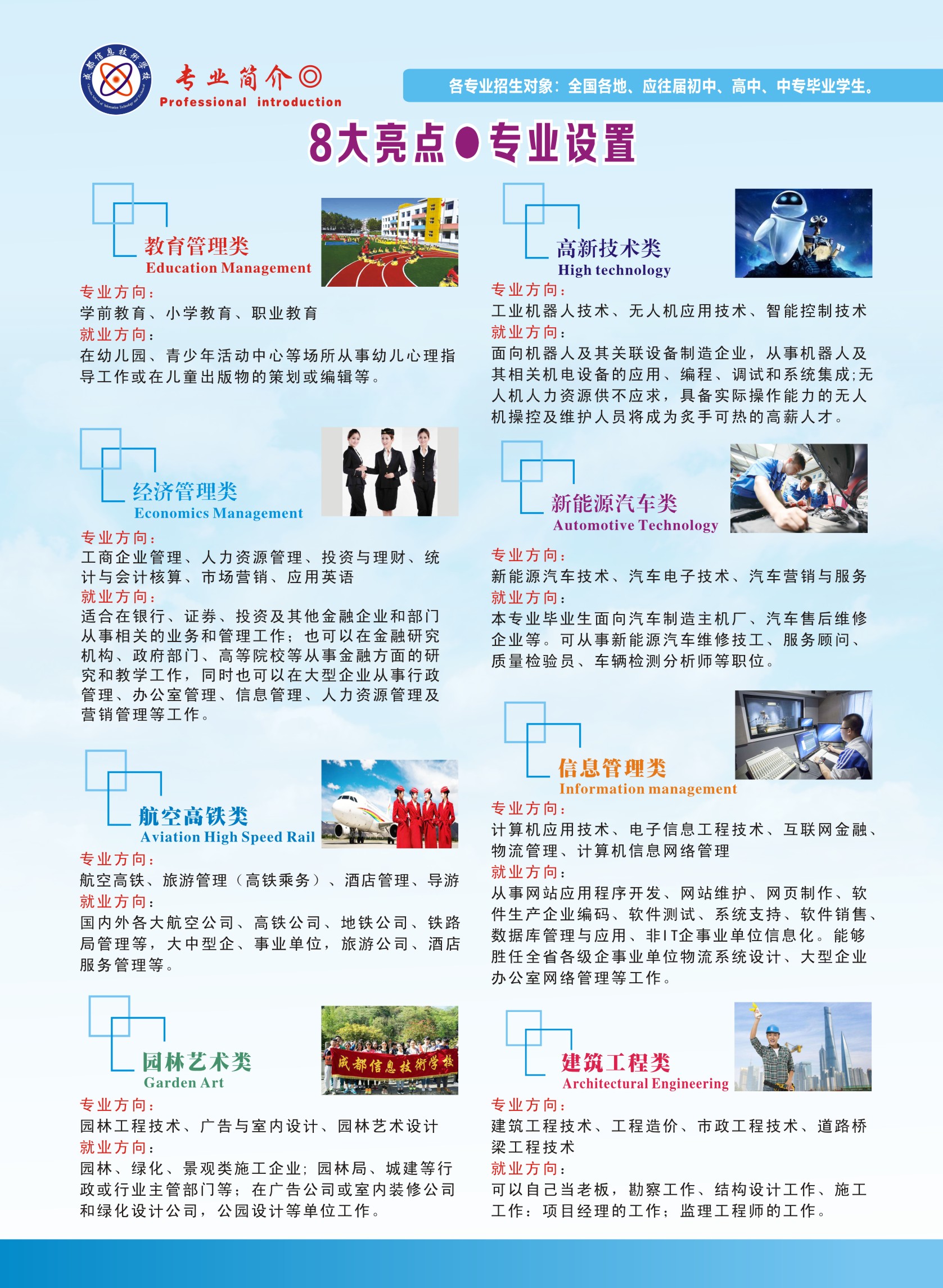 成都信息技术学校与成都信息工程学校同时创办于1988年,教育厅统一招生代码51224。建校30多年来,大力推行“统招大学保送定制班”,以敏锐的社会需求洞察力和创新的分段式教学模式,始终坚持“育人为本”的办学理念,多次被评为省市职教先进单位和诚信学校。