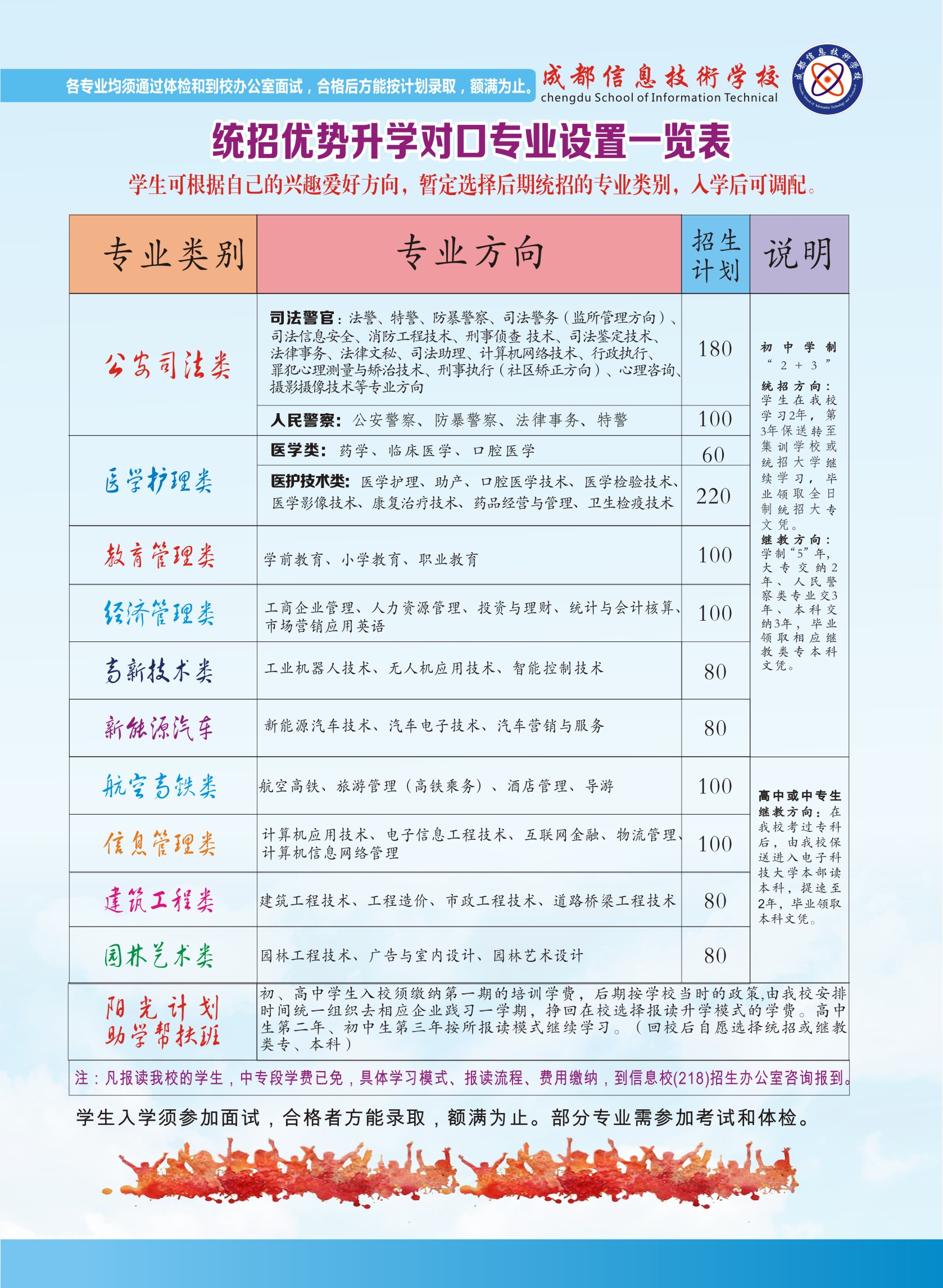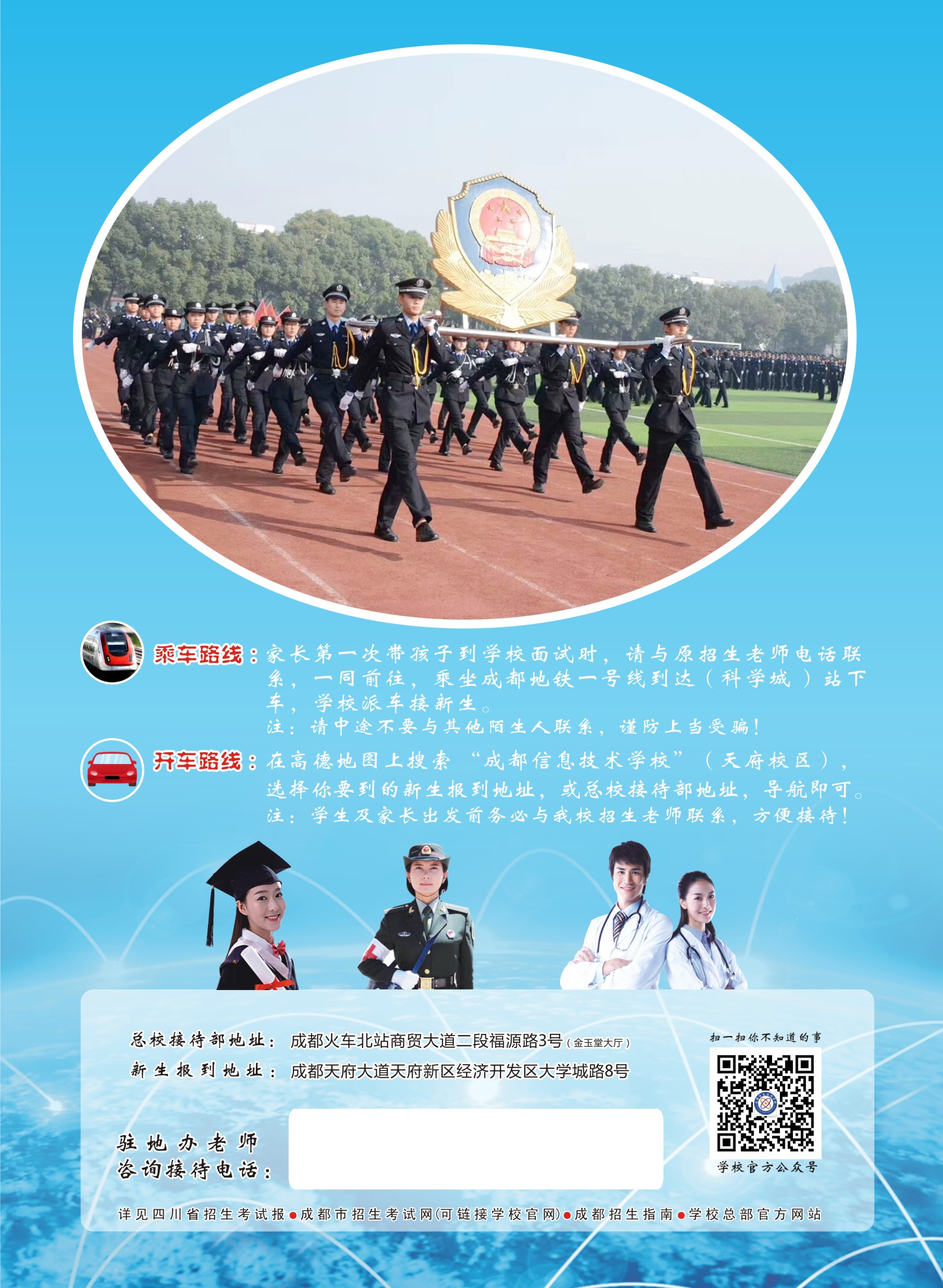 学校与黄埔警校、人民警察干部学校强强联合,组建了一支团结和谐、积极向上的团队,师资力量雄厚,用合理科学的管理模式对学生进行思维、人文、素质及文化等方向进行提升。学校与各高校强强联合,并聘请我校的联办高校优秀的教师或教授不定期的到校为学生授课,如:四川师范大学、成都信息工程大学、电子科技大学等。同时学校多元化的将学生按专业类别规划到我校的相应校区就读,实施文化课+综合素质课程学习,保送学生进入统招大学,为实现中华民族伟大复兴的中国梦、我的梦不懈奋斗。